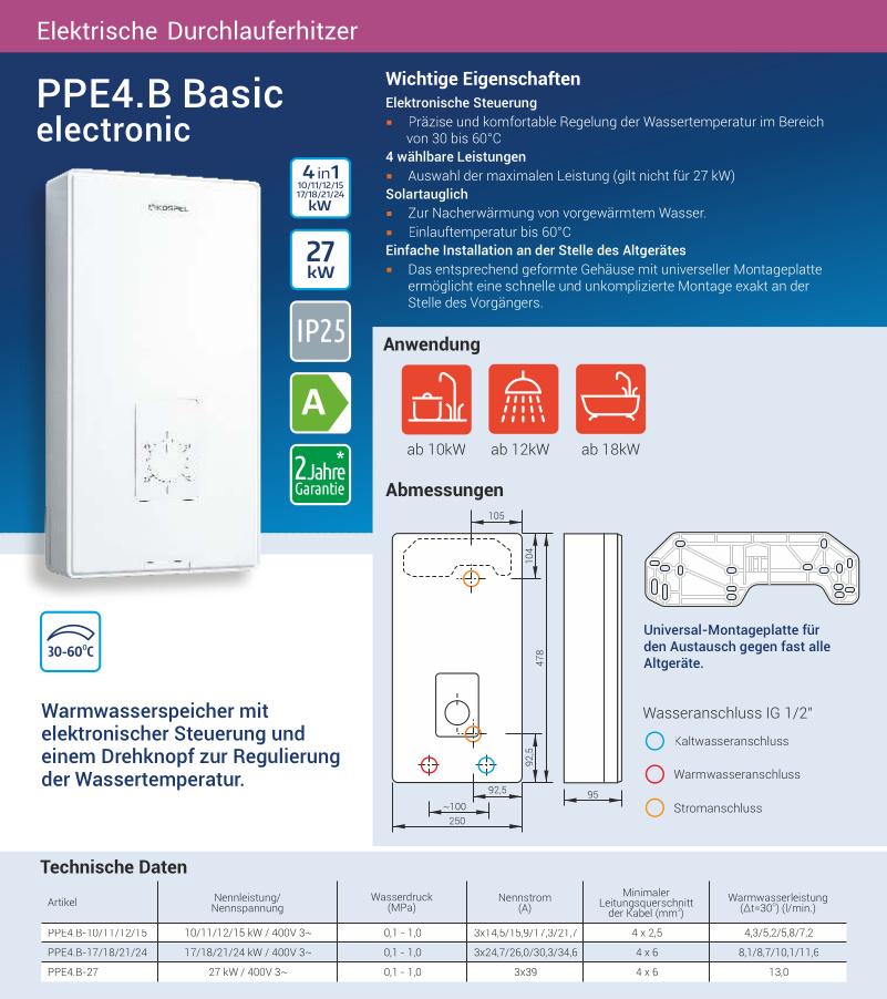 Lieferumfang: | Durchlauferhitzer PPE4 Basic 10/11/12/15 kW, Befestigungsmaterial, Bedienungsanleitung |